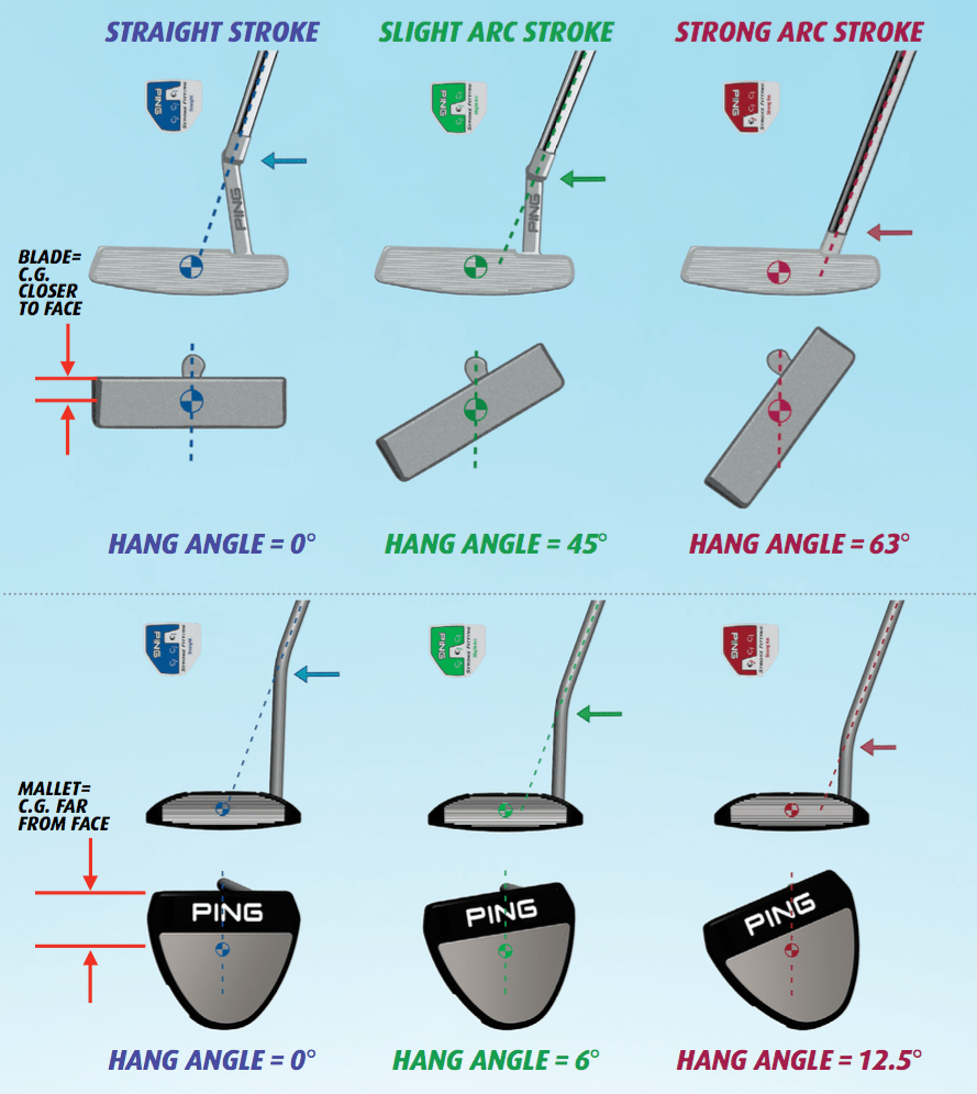 Ping has a great graphic that I’ll put in after this paragraph here to illustrate what I’m about to go over. Both the shape of the head, and especially the angle at which the golf shaft enters the head in reference to the center of the face, determines how much face balance or toe hang a putter will have. Generally the more your stroke arcs when you make a putt, the more toe hang or toe flow you need, whereas a straight back and through stroke will generally work better with a more face balanced design. As you can see below here, when looking at the putter face-on, meaning looking at the putter face itself, the angle the shaft goes into the putter head will determine how it is balanced. The closer to the sweet spot of the putter the bulk of the shaft angles into the head, the more face balanced that putter will be (see image below). The further that shaft angle moves to the heel of the putter, the more that toe will flow, the more it will work for arcing strokes that need the face to naturally open and close more through the stroke. You can also see how the size of the head changes that toe hang. Generally you won’t find many blade putters that aren’t center shafted or with odd acute angle plumber’s necks like you see in the top left image there that are face balanced. As you can see with the image as well (ASIDE FROM CENTER SHAFTED DESIGNS) it’s pretty easy to see the higher the bend in the shaft away from the putter head, or the longer the neck of the putter, the more that will send the shaft away from the toe and toward the center, creating more face balance. So simply put, the less your stroke arcs, the higher you probably want that bend in the putter shaft, and the larger you want your putter head to be.