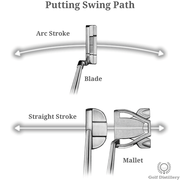 The next thing you can do to help you narrow down your putter selection is to determine the shape of your stroke, check out the image to the right. Whether you try to take the putter head straight back and through, you naturally follow the gentle arc around your body, or you take the putter inside on a sharper arc around your body is very important to the fitting process. Determining how much “toe hang” or “toe flow” or what level of face balance you need with the shape of your stroke is not possible to do perfectly on your own, but narrowing down the putters that would likely work better for you than others is actually pretty easy to explain (though not without a high word count…).